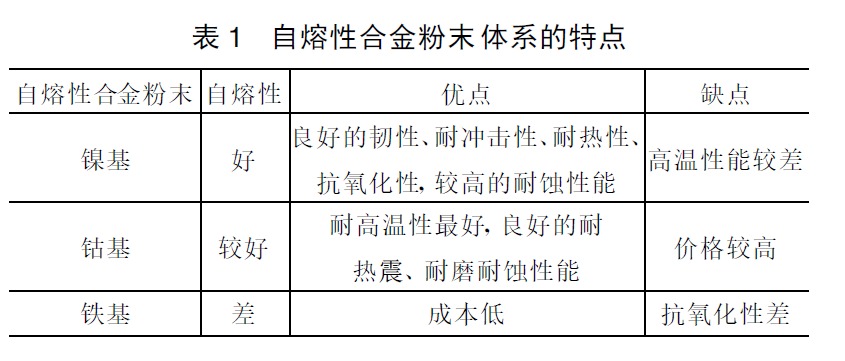 綜合分析可以看出,Ni基或Co基自熔性合金粉末體系具有良好的自熔性和耐蝕、耐磨、抗氧化性能,但價格較高;Fe基自熔性合金粉末雖然便宜,但自熔性差,易開裂和氧化。因此,在實際應用中,應根據使用要求合理選擇自熔性合金粉末體系。