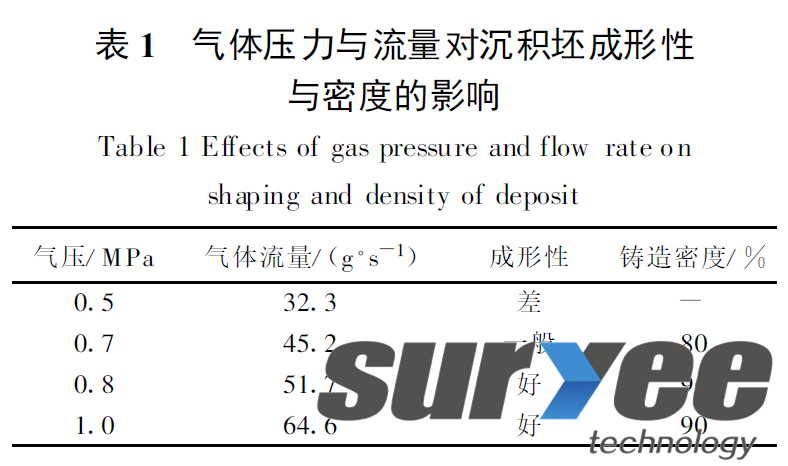圖5比較了霧化氣體軸線速度隨與噴嘴的距離的變化的實驗值與計算值,可見理論計算值與實驗值能較好地吻合。熊柏青等利用數值模擬與實驗相結合的辦法,研究氣體壓力、氣流流量、拉拔速度等工藝參數對圓坯與管坯制備的影響。在研究制取管坯時發現,在基體同時作轉動和平移的情況下,當轉動頻率和平移速度的比值很大,而其它沉積參數選擇合適時,可以制得厚度均勻的高密度管坯,且沉積效率最高。表1表示了氣體壓力和氣體流量對管坯形狀和密度的影響。在研究圓坯的制備時發現,其它技術參數一定時,可以通過調節拉拔速度制備不同直徑的圓坯,氣液比直接影響圓坯的形狀。